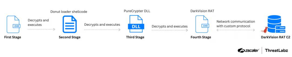 พบแคมเปญการโจมตีที่อาศัย PureCrypter ในการส่ง Payload มัลแวร์ DarkVision RAT ซึ่งเป็น Remote Access Trojan (RAT) ที่พัฒนาด้วยภาษา C/C++ และ Assembly โดย DarkVision RAT ได้รับความนิยมในกลุ่มแฮกเกอร์ เนื่องจากเป็นเครื่องมือที่ราคาไม่สูง ใช้งานง่าย และมีฟีเจอร์ที่หลากหลาย เช่น Keylogging การดัดแปลงไฟล์ การบันทึกภาพหน้าจอ Process Injection และ RCE เป็นต้น