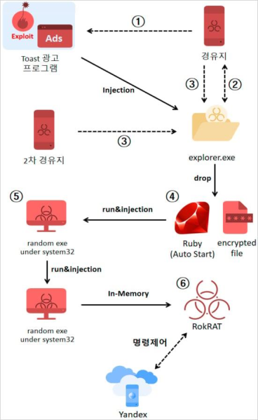 กลุ่มแฮกเกอร์ ScarCruft ใช้ช่องโหว่ใน Internet Explorer ฝังสคริปต์อันตรายในโฆษณา เมื่อโฆษณาถูกโหลด มัลแวร์ RokRAT จะถูกติดตั้งผ่านการฉีดโค้ดในกระบวนการ explorer.exe มัลแวร์จะทำงานอัตโนมัติเมื่อเปิดระบบ ซ่อนตัวในไดเรกทอรี system32 และเชื่อมต่อกับเซิร์ฟเวอร์ควบคุมเพื่อขโมยข้อมูล บันทึกการพิมพ์ และจับภาพหน้าจอ