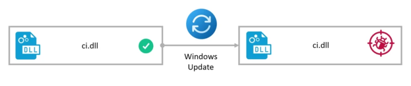- ต่อจากนั้นจะทำการใช้งาน Windows Downgrade เพื่อควบคุมกระบวนการอัปเดตของ Windows โดยอาศัยช่องโหว่ที่อนุญาตให้ Downdate ไฟล์ระบบสำคัญ ๆ ได้ เช่น ไฟล์ ci.dll ซึ่งเป็นไฟล์ที่ทำหน้าที่ตรวจสอบ Driver Signature