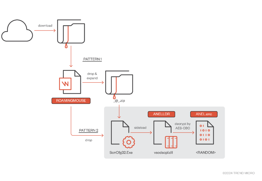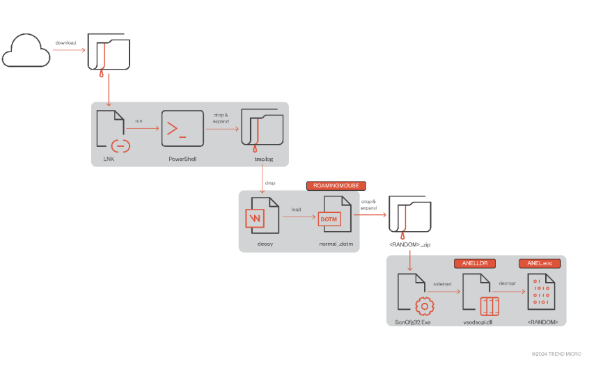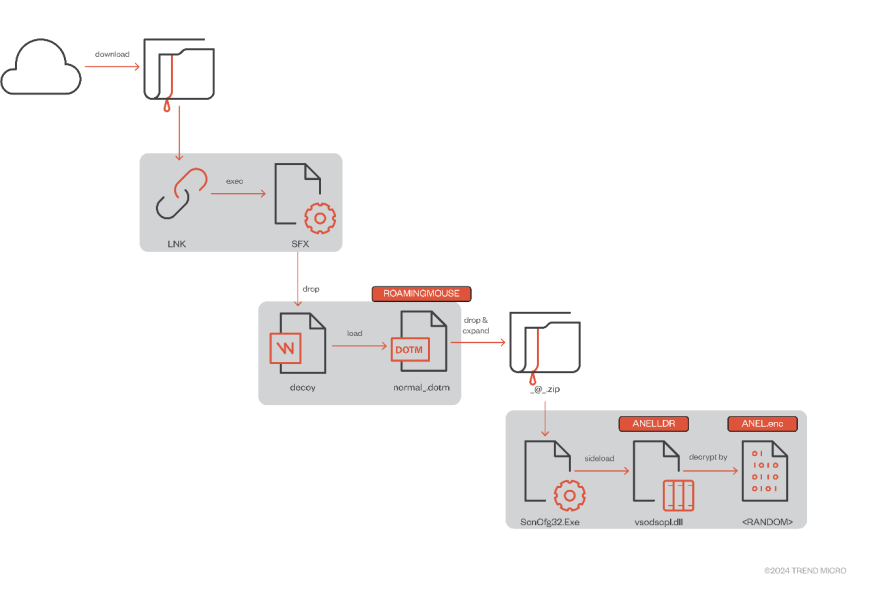 - ใช้ไฟล์ Shortcut ในวิธีนี้ไฟล์ ZIP ไม่ได้มี ROAMINGMOUSE อยู่ภายในไฟล์โดยตรง แต่จะประกอบด้วยไฟล์ Shortcut และไฟล์ SFX (Self-extracting Archive ) ที่ปลอมเป็นรูปแบบไฟล์ .docx เมื่อไฟล์ SFX ถูกเปิด จะทำการติดตั้งไฟล์ 2 รายการลงในโฟลเดอร์ %APPDATA%MicrosoftTemplates ได้แก่ ไฟล์เอกสารที่ไม่เป็นอันตราย และไฟล์ normal_.dotm ที่มี ROAMINGMOUSE อยู่ เมื่อเหยื่อเปิดไฟล์เอกสาร ROAMINGMOUSE จะถูกโหลดในรูปแบบ Word Template โดยอัตโนมัติ จากนั้นกระบวนการติดตั้งมัลแวร์จะดำเนินต่อไปตามลำดับเดียวกับวิธีที่ 1
