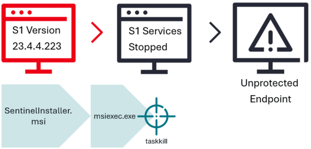 การโจมตีเริ่มต้นจากแฮกเกอร์ใช้เทคนิคที่เรียกว่า Bring Your Own Installer (BYOI) โดยนำไฟล์ Installer ของ SentinelOne ที่ถูกต้องมาใช้หลีกเลี่ยงการตรวจจับ เมื่อเริ่มกระบวนการติดตั้ง Agent ใหม่ ไฟล์ Installer จะทำการหยุดการทำงานของ SentinelOne EDR ชั่วคราว แฮกเกอร์จึงใช้โอกาสนี้ปิด Process การติดตั้ง msiexec[.]exe ส่งผลให้ระบบไม่มี EDR ทำงาน