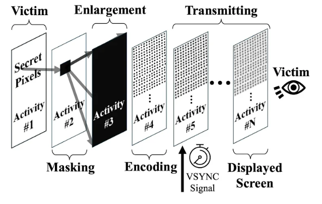 - Transmitting: เมื่อ pipeline ทำงานตามสัญญาณ VSYNC การเปลี่ยนแปลงพิกเซลที่ถูกตั้งค่าไว้จะปรากฏเป็นความต่างของค่าสี หรือเวลา ซึ่งแอปโจมตีสามารถวัดผลลัพธ์เหล่านี้ผ่านช่องไซด์แชนแนลที่อาศัยพฤติกรรมของ GPU/iGPU, การบีบอัดกราฟิก หรือการอ่านพารามิเตอร์กราฟิกอื่น ๆ แบบไม่ต้องสิทธิพิเศษ ค่าที่วัดได้จะถูกถอดรหัสเพื่อค้นหาตำแหน่งพิกเซลที่มีข้อมูลสำคัญ